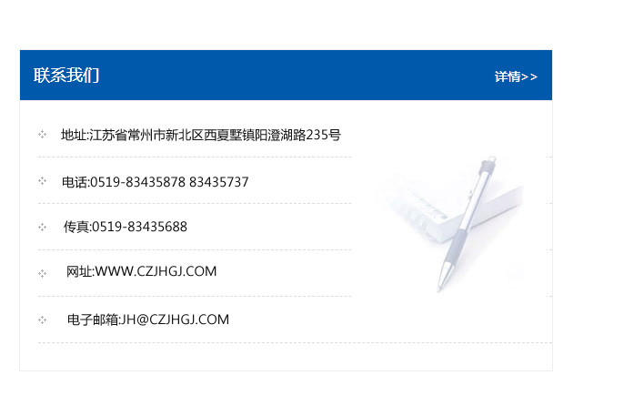 地址:常州市新北區友邦商務大廈1幢16、17層  電話:0519-85101652  傳真:0519-85112595  郵編:213022  網址:www_cz-jiayue_cn.tszhengxie.com  郵箱:xiajifengaa@163.com